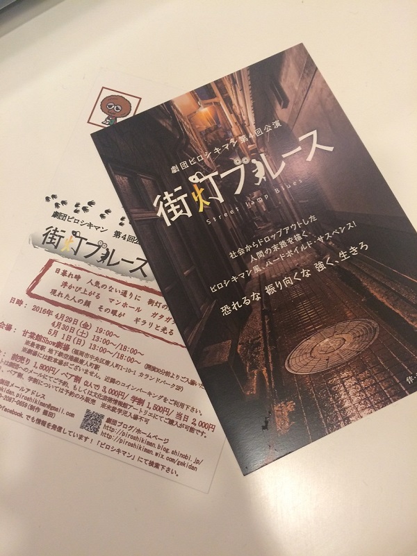 日付を超えてしまいました。 おはようございます、こんにちは。 制作ヤマダです。 昨日は集中稽古、芝居をつめたり 今回とても大切なある装置を初めておいてみたり メイクさん、音響さん立会いのもと通し稽古をやったり 濃密な日でしたので出演者ブログはひと息。 チケット情報をお伝えします! お気づきの方もいらっしゃるかもですが、 ものすごい速さでお席が埋まっていってます。 4/30 13:00〜と、5/1 13:00〜 こちら前売り予定枚数はご予約、ご購入頂き前売り受付終了となりました! ありがとうございます!! 4/29 19:00〜も、まもなく前売終了となります。 本当にわずかなのでもしかしたら今日中に終了するかも・・・!? 4/30 18:00〜、5/1 18:00〜 この二回はまだまだお席ご用意できます。 観に行こうかな〜と迷われているみなさま、どうぞよろしくお願い致します!! また、以前ピロシキマンを観に来て頂き、アンケートに記入されたお客様には こういったDMハガキを送っています。 こちら、当日受付にお持ち頂くと\100キャッシュバック! どうぞご利用ください☆ チケット予約のやりとりやその他で携帯が鳴りっぱなしです。 心を静めたくて、昨日は駅から家まで歩いてみました。 ちょうどいい気温の中、50分ちょっと。 2回しか角を曲がらない超直線コース。 多分次からは自転車置いときます。 --------------------- 劇団ピロシキマン 第4回公演 「街灯ブルース」 作・演出 みかんひろし 【日時】 4/29(金)19:00 4/30(土)13:00/18:00 5/ 1(日)13:00/18:00 ※開場は開演の30分前 【残席情報】 4/29 19:00 △あとわずか 4/30 13:00 ×前売終了 4/30 18:00 ○余裕あり 5/1 13:00 ×前売終了 5/1 18:00 ○余裕あり 【会 場】 甘棠館Show劇場 【料 金】 一般前売り1,800円 学割 1,500円 ペア割 2枚で3,000円 当日券 2,000円 ※未就学児入場不可 ※学割、ペア割は要予約 各回お席が少なめとなっております。 チケットのご予約は劇団HPからも可能です! 【キャスト】 篠田昌人 中山ヨシロヲ 杉山英美 中山大介 ERI 中島浩志 篠崎絵里 永友裕梨(96文字) 社会からドロップアウトした人間の末路を描く ピロシキマン風、ハードボイルド・サスペンス! 劇団ホームページ:http://piroshikiman.wix.com/gekidan PR